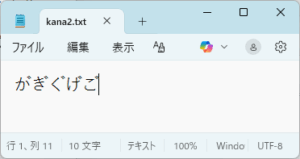 先ほどのノートパッドの画像の下部に文字数が表示されています。気がつかれた方もいらっしゃると思いますが、その文字数がkana1.txtは5文字、kana2.txtでは10文字になっています。つまりkana1.txtは合成済み文字、kana2.txtは結合文字で表していたのです。