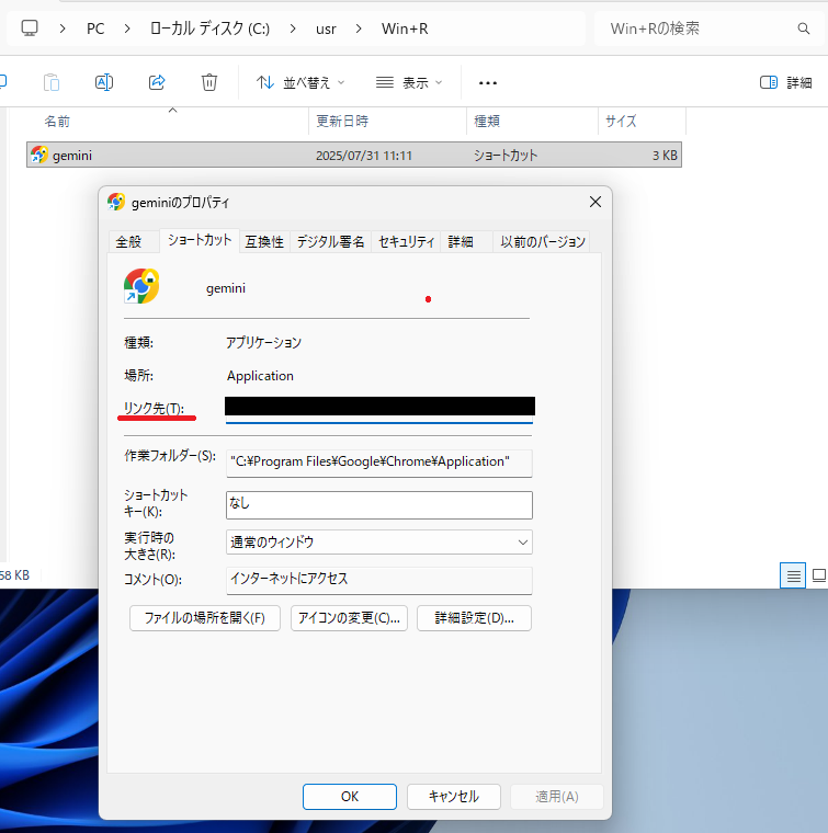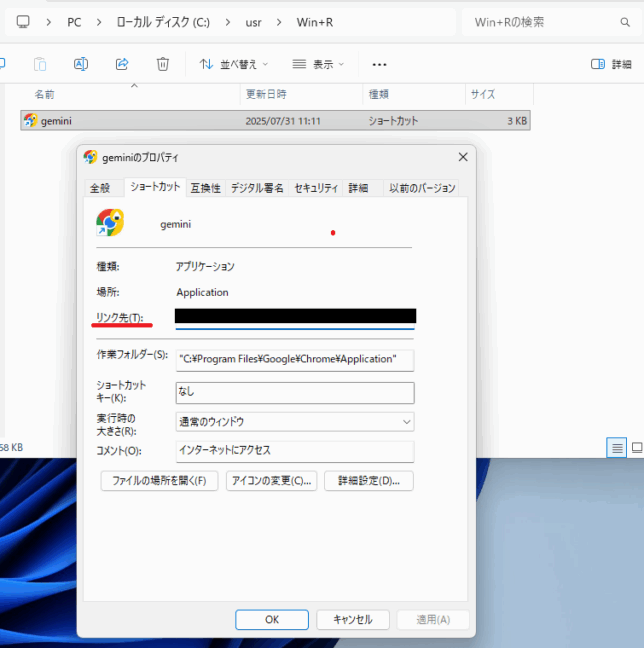 リンク先について、すでにある値(“XXX\chrome.exe”)の後に「(半角スペース)”任意のURL”」を追記し、OKを押下。