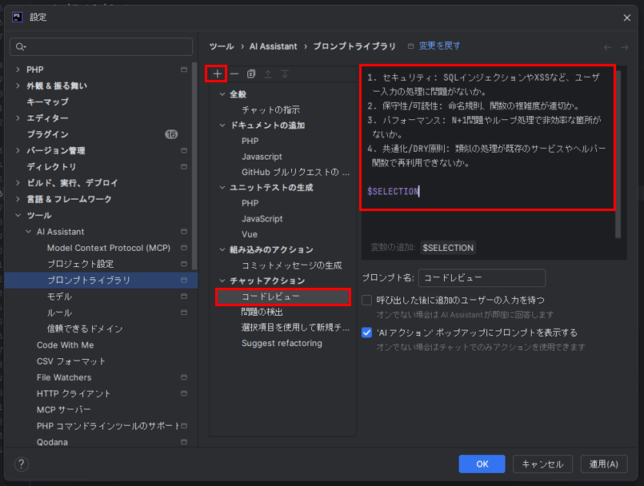 設定から「ツール > AI Assistant > プロンプトライブラリ」を選択し、以下の内容をプロンプトに登録します。