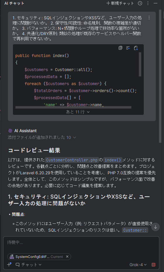 レビュー対象の関数を選択して実行すると、AIチャットに選択した関数に対して登録したレビュー基準のプロンプトを入力・実行することができました。