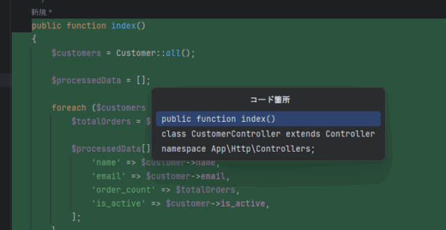 ソースファイルを開き、レビューを行う関数で「右クリック > AIアクション」を選択するとメニューに「コードレビュー」が表示されました。
