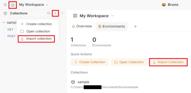 続いて画面左上「Collections」の右隣にある「+」アイコンを押下後、「Import Collection」を押下するか、画面左上の「ホーム」アイコンを押下してホーム画面を開き、「Import Collection」を押下します。