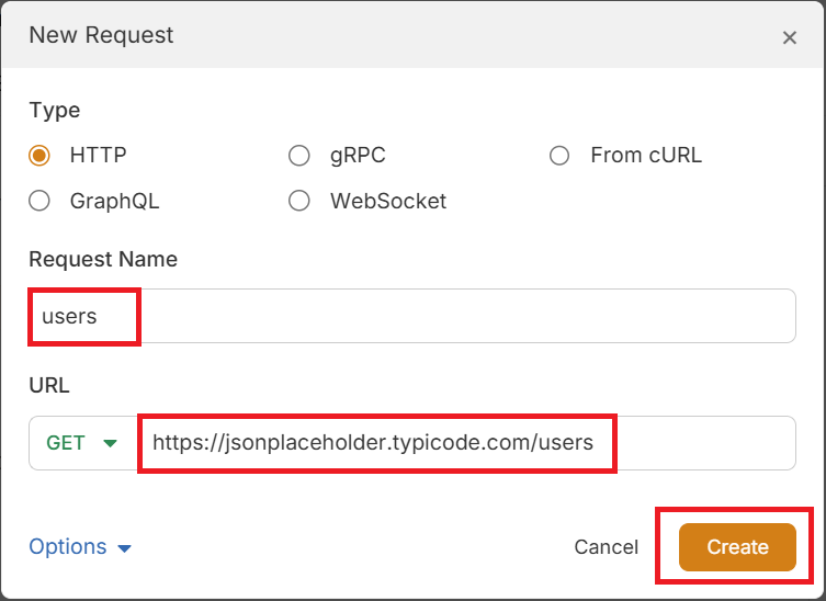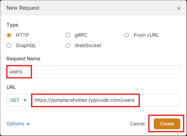 表示されるダイアログに「Request Name」とリクエスト送信先URLを入力後、「Create」ボタンを押下します。