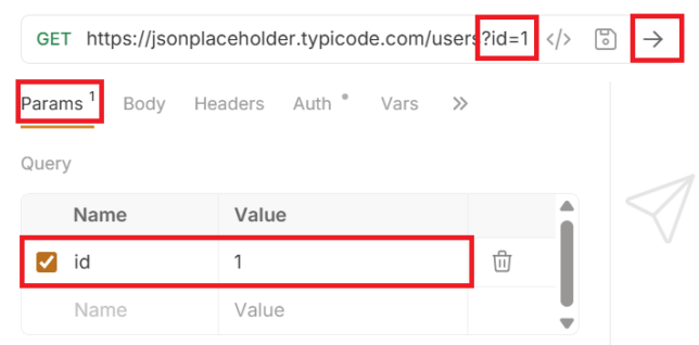 パラメータは「Params」タブの「Query」に値を入力後、「→」アイコンを押下してリクエストを送信します。