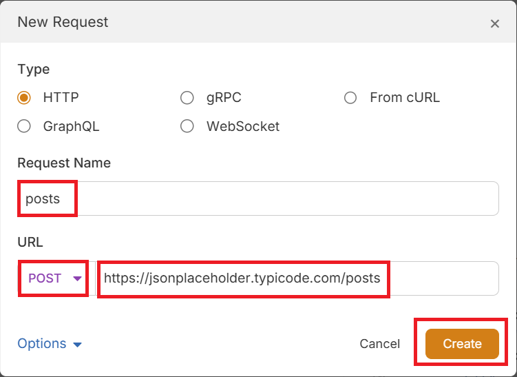 先程と同様にコレクションの右にある三点リーダーから「New Request」を押下して表示されるダイアログに「Request Name」と、リクエスト送信先URLを入力、HTTPメソッドを「POST」へ変更して「Create」ボタンを押下します。