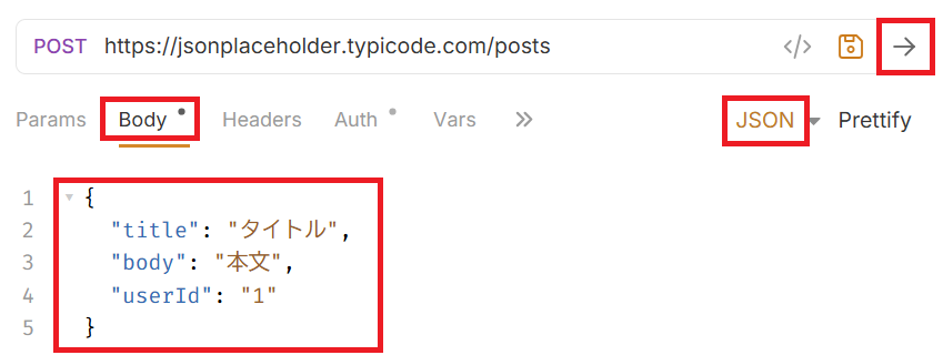 リクエストボディは「Body」タブからJSON形式を選択して値を入力後、「→」アイコンを押下してリクエストを送信します。