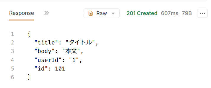 ※実際にJSONPlaceholderのデータベースに登録されるわけではなく、登録されたかのようにレスポンスが返ってきます